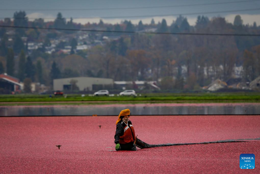 A farmer pulls a floating boom to harvest cranberries in a pond in Richmond, British Columbia, Canada, on Oct. 15, 2024. (Photo by Liang Sen/Xinhua)