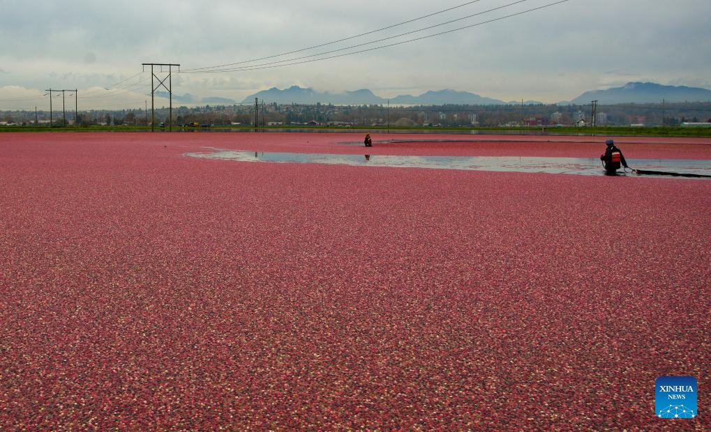 Farmers pull a floating boom to harvest cranberries in a pond in Richmond, British Columbia, Canada, on Oct. 15, 2024. (Photo by Liang Sen/Xinhua)