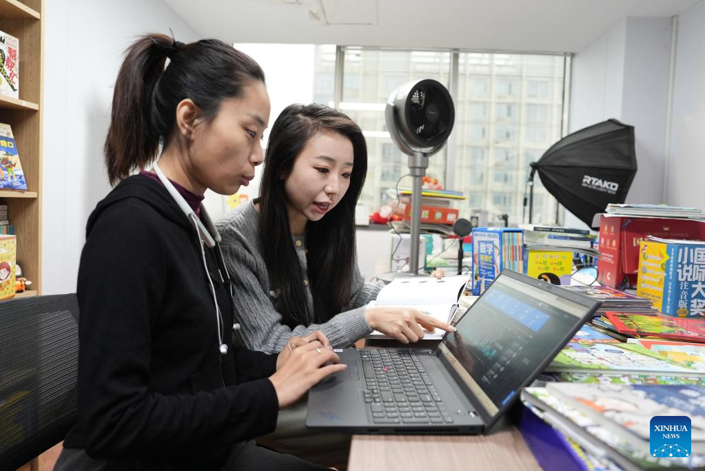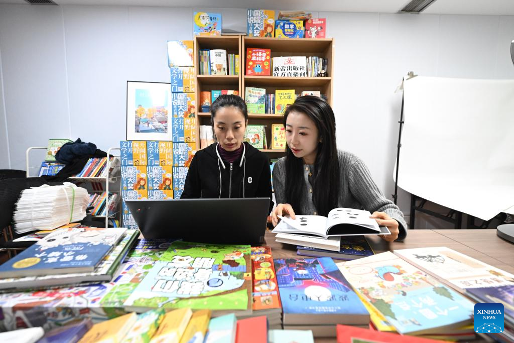 Dong Lu (R) and Zhang Quan prepare for the livestreaming at New Buds Publishing House in north China's Tianjin, Nov. 13, 2024.