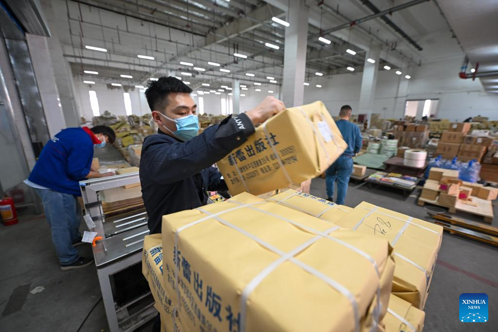 Staff members pack books at a factory of New Buds Publishing House in north China's Tianjin, Nov. 12, 2024.