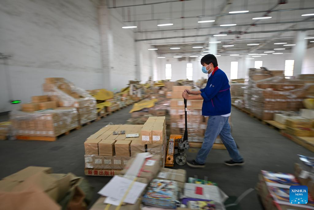 A staff member sorts books at a warehouse of New Buds Publishing House in north China's Tianjin, Nov. 12, 2024.