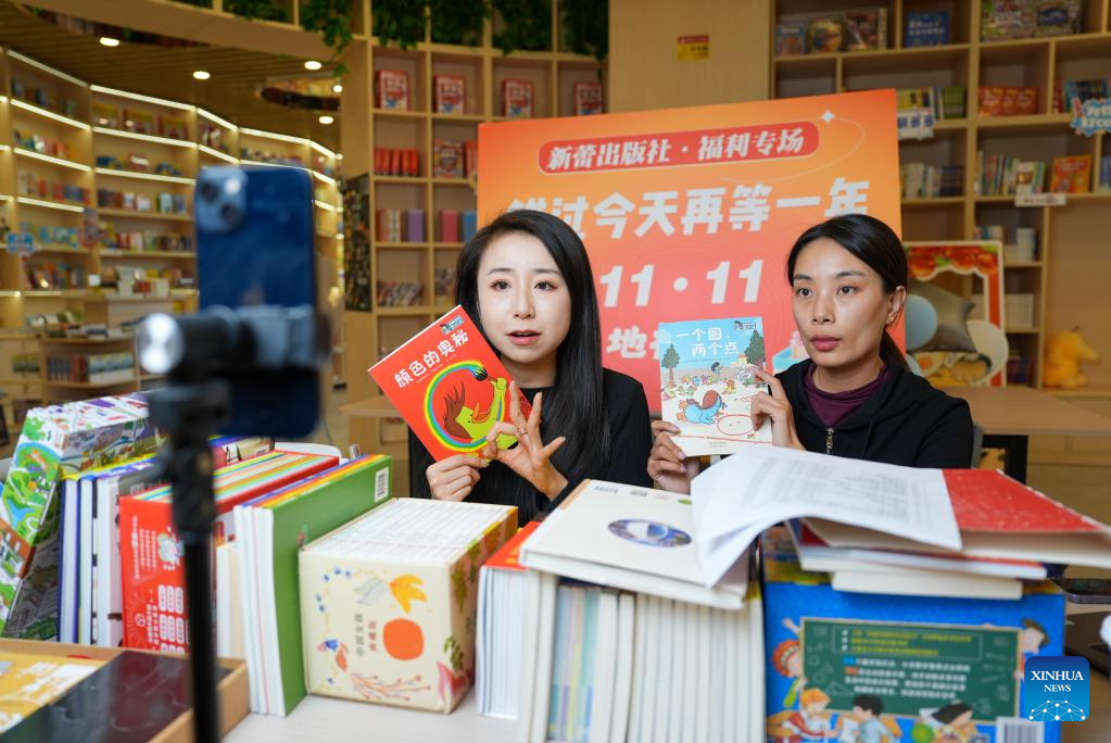 Dong Lu (L) and Zhang Quan sell books via livestreaming at a reading space in north China's Tianjin, Nov. 11, 2024.