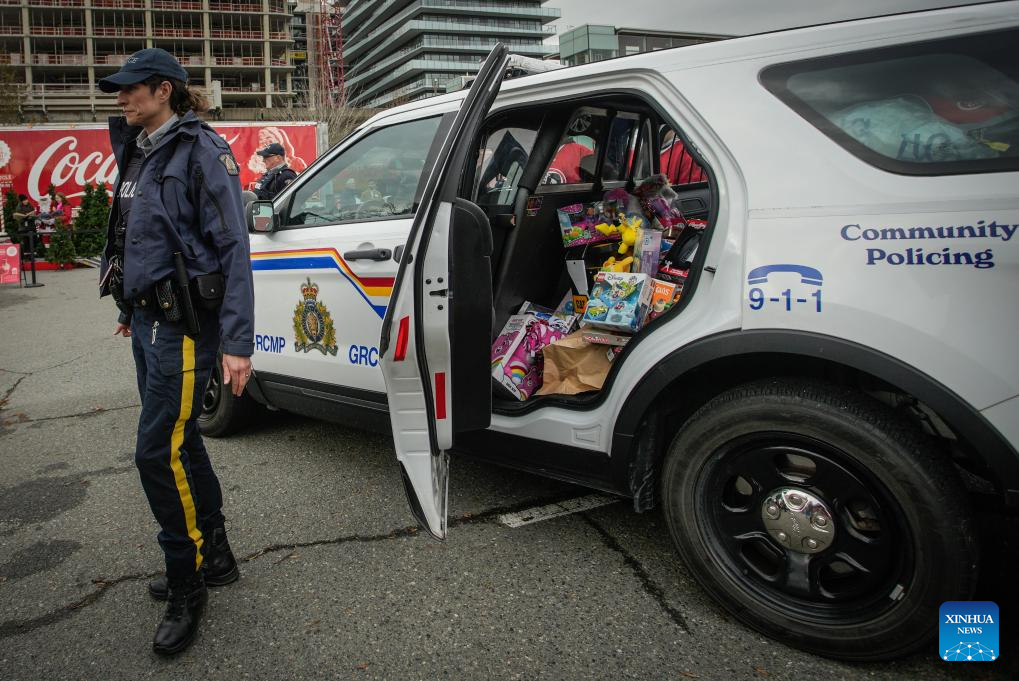 A police officer loads donated toys into a police vehicle during the 10th annual Royal Canadian Mounted Police (RCMP) Toy Drive event in Richmond, British Columbia, Canada, Nov. 23, 2024. (Photo by Liang Sen/Xinhua)