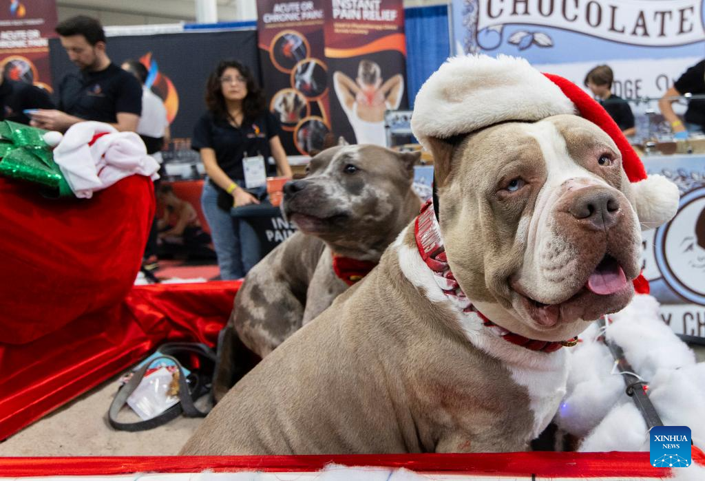 Dressed-up pet dogs are seen at the 2024 Christmas Canadian Pet Expo in Mississauga, Ontario, Canada, on Nov. 23, 2024. (Photo by Zou Zheng/Xinhua)