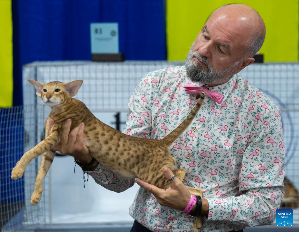 A judge checks a pet cat at the 2024 Christmas Canadian Pet Expo in Mississauga, Ontario, Canada, on Nov. 23, 2024. (Photo by Zou Zheng/Xinhua)