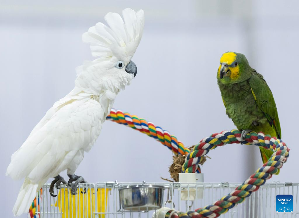 Parrots are pictured at the 2024 Christmas Canadian Pet Expo in Mississauga, Ontario, Canada, on Nov. 23, 2024. (Photo by Zou Zheng/Xinhua)