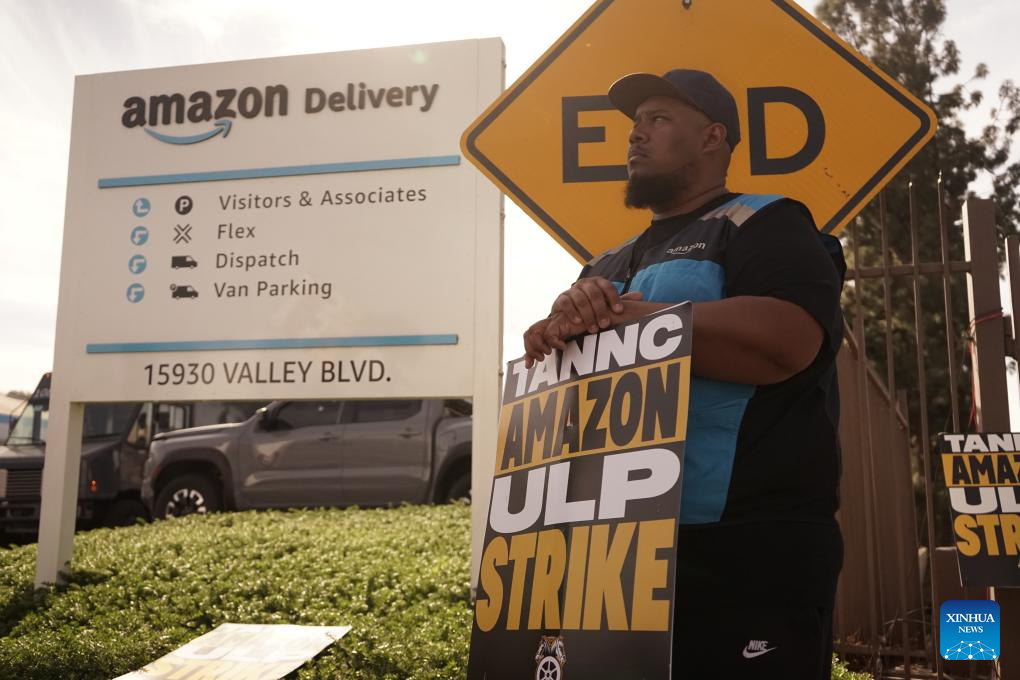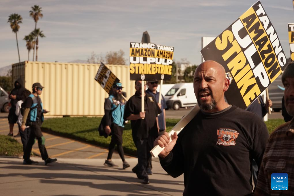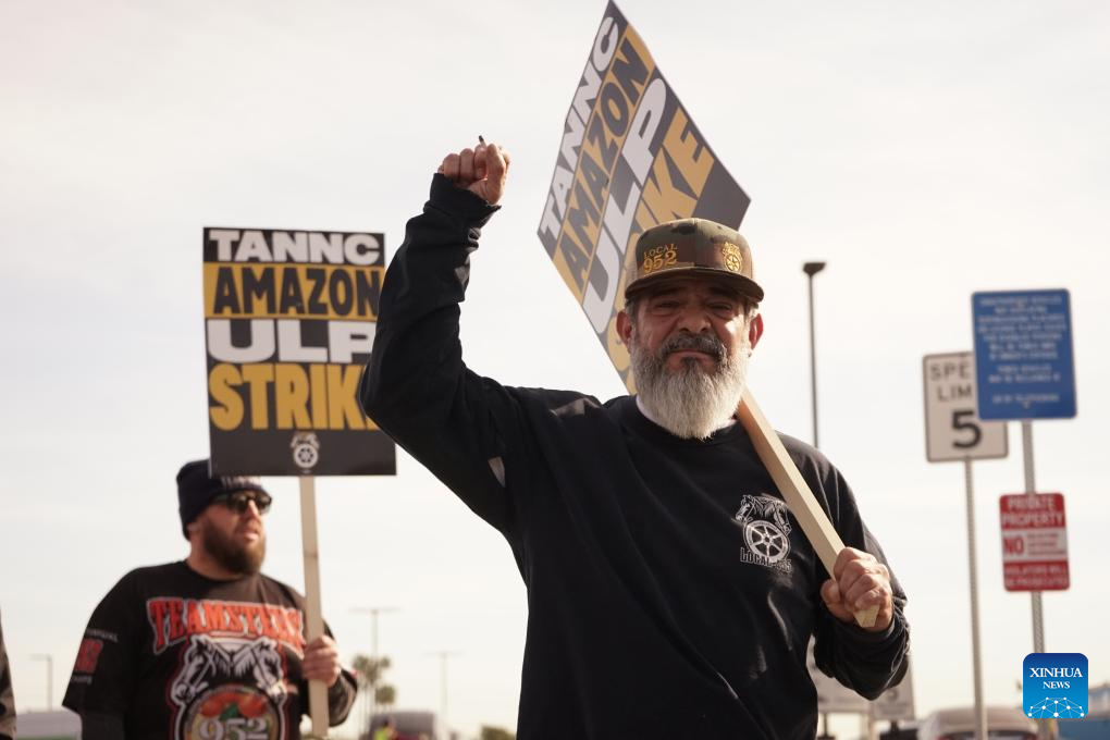 Amazon workers protest in front of an Amazon facility in the City of Industry, Los Angeles County, California, the United States, on Dec. 19, 2024. United Amazon workers from many warehouses in the United States have announced a strike beginning Thursday after they failed to reach an agreement on labor negotiations with the online retail giant. The International Brotherhood of Teamsters, the union representing 10,000 Amazon workers, said in an announcement on Wednesday night that the decision was made as the company refused to recognize their union and would not negotiate a fair contract. (Photo by Zeng Hui/Xinhua)