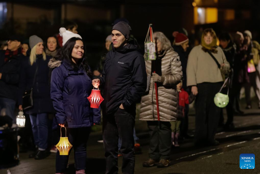 People holding home-made lanterns take part in a procession during the Winter Solstice Lantern Festival in Vancouver, British Columbia, Canada, Dec. 21, 2024. (Photo by Liang Sen/Xinhua)