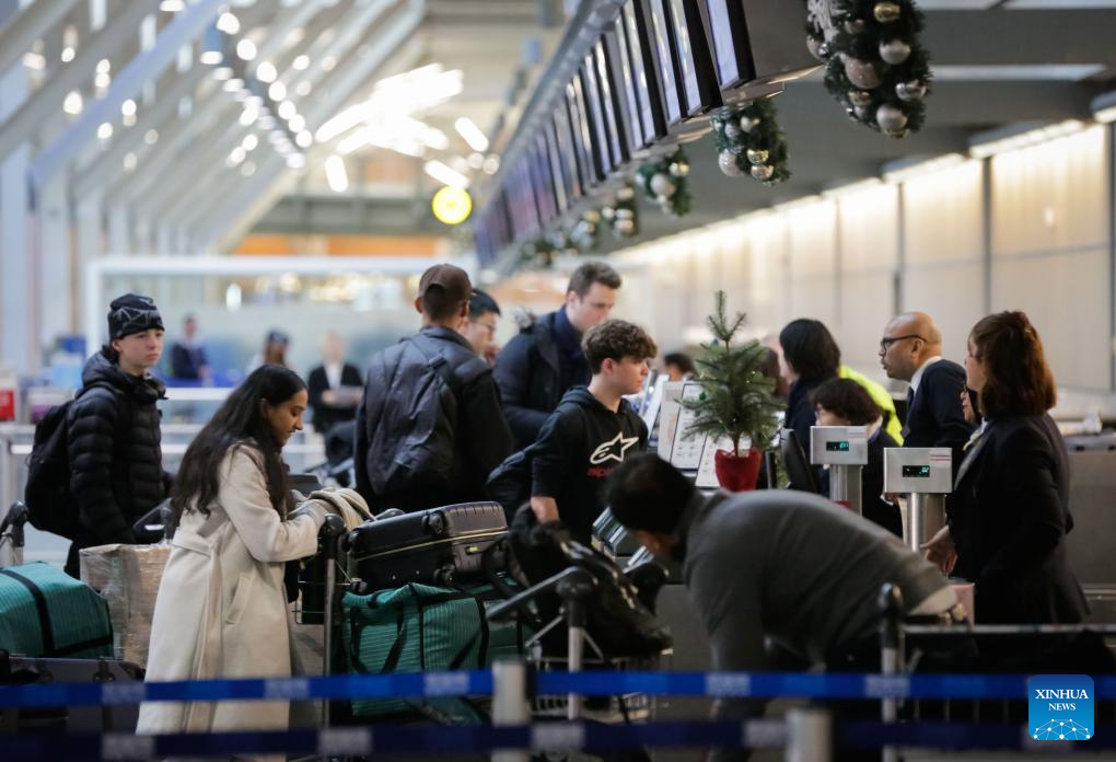 Travelers are seen at the Vancouver International Airport in Richmond, British Columbia, Canada, Dec. 21, 2024. With Christmas just around the corner, Vancouver International Airport is preparing for its busiest travel season. (Photo by Liang Sen/Xinhua)