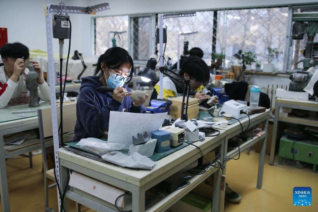 An apprentice of Li Chunke makes an antler carving artwork at Li Chunke's studio in Beijing, capital of China, Dec. 17, 2024. (Xinhua/Li Xin)