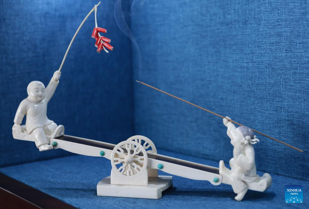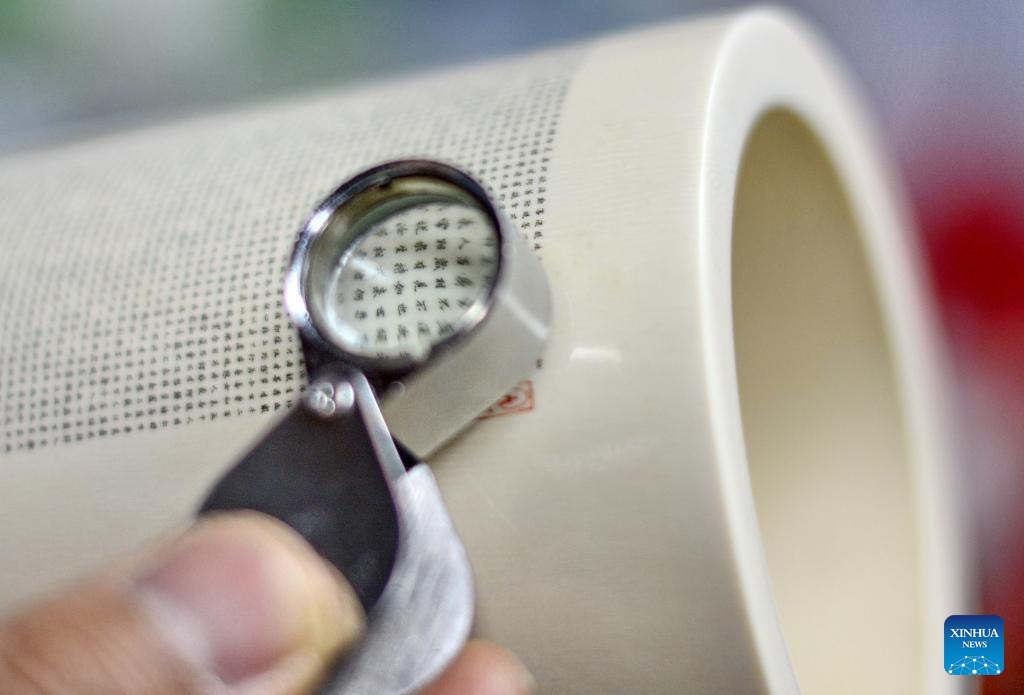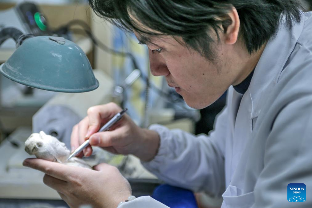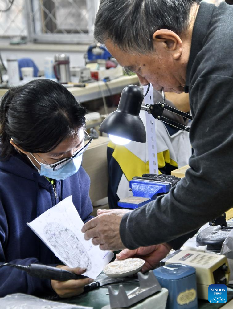 An apprentice of Li Chunke works at the studio of Li Chunke in Beijing, capital of China, Dec. 17, 2024. (Xinhua/Li Xin)