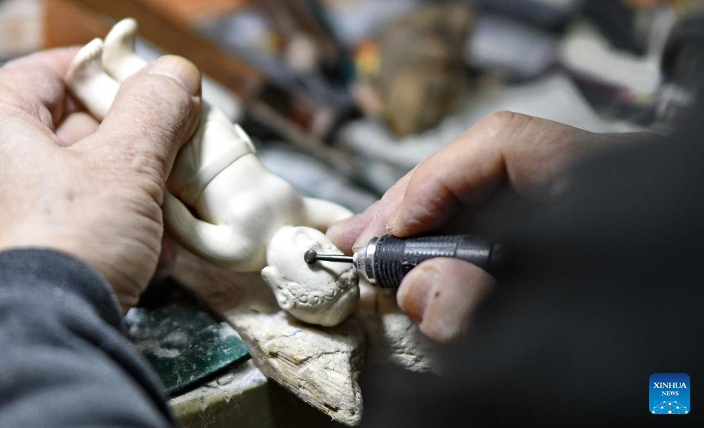 Li Chunke makes a mammoth tusk carving artwork at his studio in Beijing, capital of China, Dec. 17, 2024. (Xinhua/Li Xin)