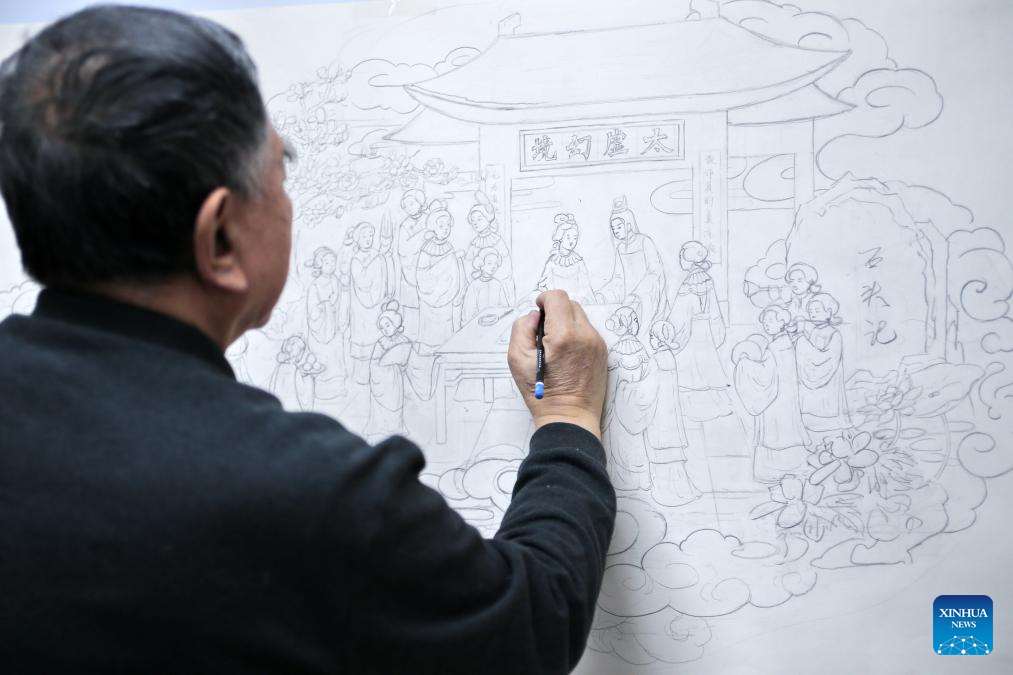 This photo taken on Dec. 17, 2024 shows a picture for designing ivory carving artwork displayed at the studio of Li Chunke in Beijing, capital of China. Ivory Carving, an ancient craft in China, was famous for its elegance due to its pure white material -- ivory. The earliest ivory carving artwork was found in a cultural relic in China during the Neolithic Age, dating back to 7,000 years ago. Beijing Ivory Carving, featuring elegant and luxuriant styles inherited from the imperial art, goes through several main procedures before completion such as designing, hewing, shoveling, face shaping and grinding.