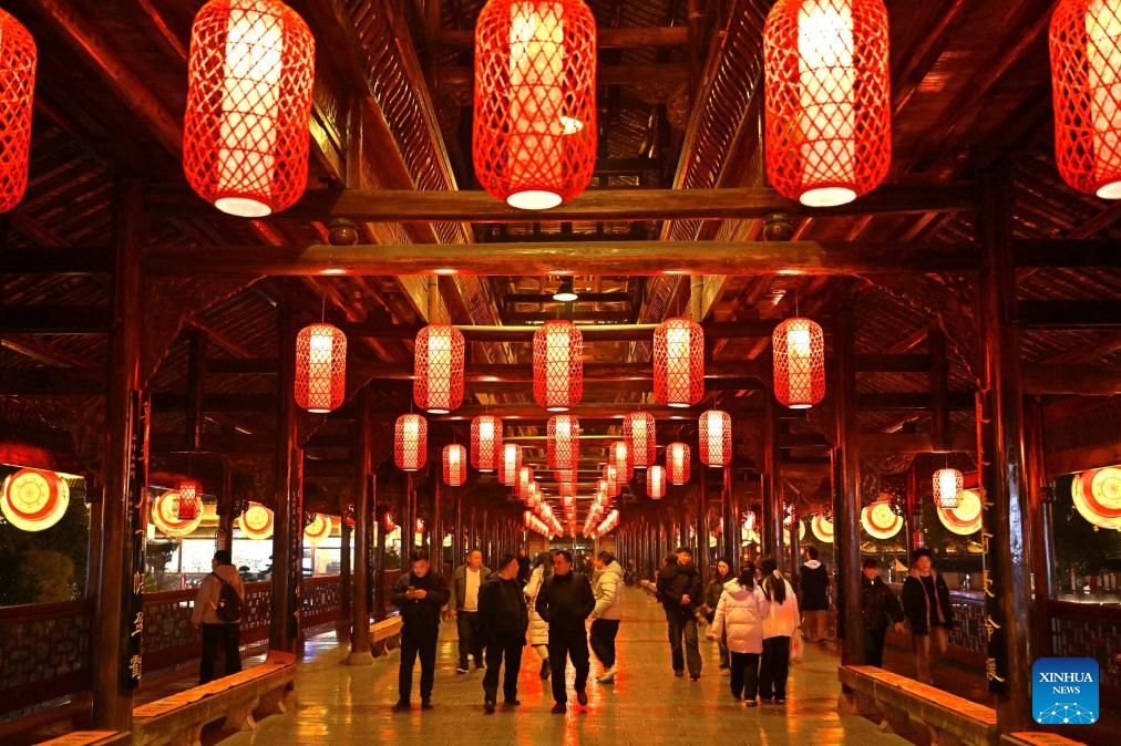 Tourists visit the Fengyu Bridge adorned with lanterns in Xuan'en County, central China's Hubei Province, Dec. 28, 2024. China is gearing up for the upcoming New Year 2025 with festive decorations and various activities nationwide. (Photo by Song Wen/Xinhua)