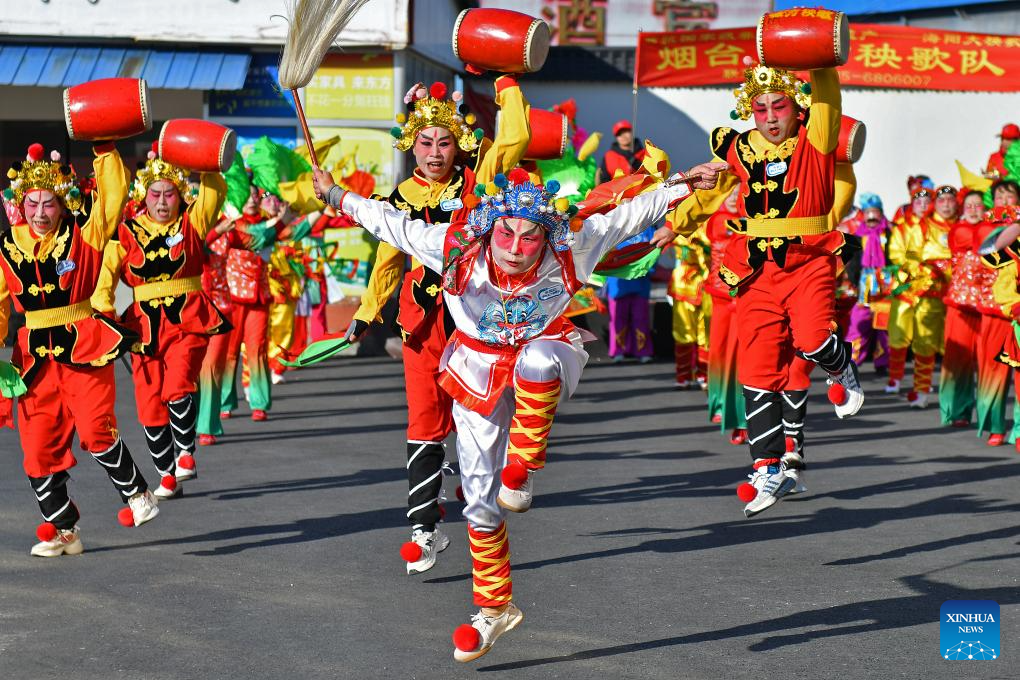 Folk artists perform at a market in Zhifu District, Yantai, east China's Shandong Province, Dec. 29, 2024. China is gearing up for the upcoming New Year 2025 with festive decorations and various activities nationwide. (Photo by Sun Wentan/Xinhua)