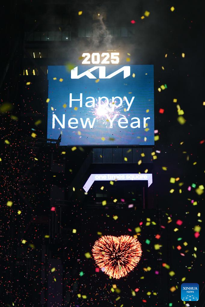 Fireworks explode during a New Year celebration at Times Square in New York, the United States, Jan. 1, 2025. (Xinhua/Li Rui)