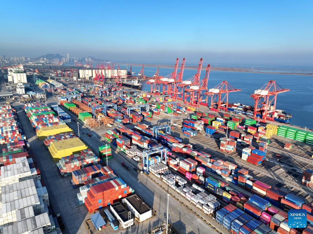 An aerial drone photo shows the container terminal of Lianyungang Port in east China's Jiangsu Province, Jan. 3, 2025. China's major ports are busy at the beginning of the new year. (Photo by Wang Chun/Xinhua)