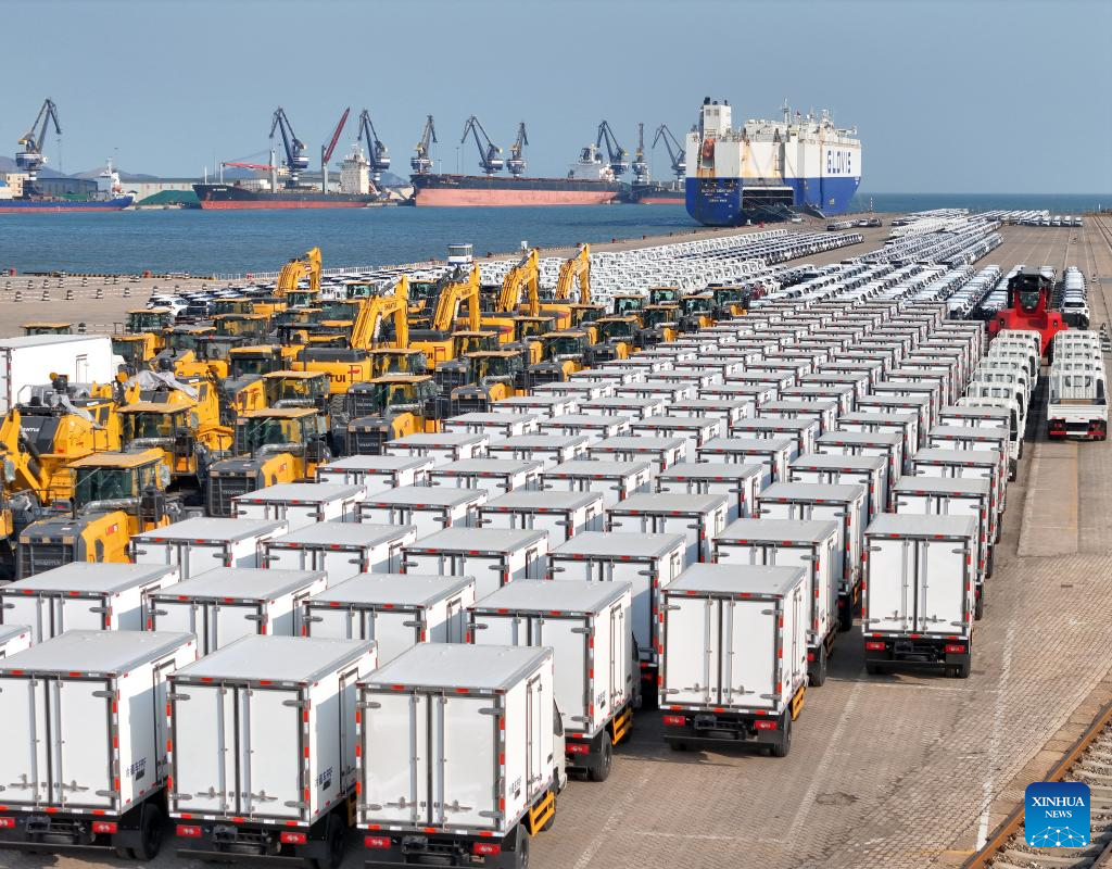 An aerial drone photo shows vehicles to be exported at Yantai Port in east China's Shandong Province, Jan. 2, 2025. China's major ports are busy at the beginning of the new year. (Photo by Tang Ke/Xinhua)