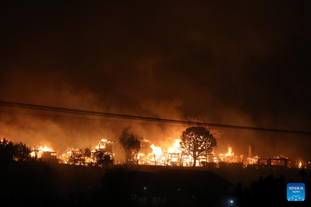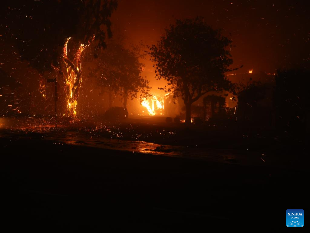 Houses are engulfed by the flames on the site of the Palisades fire in Pacific Palisades, Los Angeles County, California, the United States, on Jan. 7, 2025. Three major wildfires raging across Los Angeles County, the most populous county of the United States, killed at least two people and forced tens of thousands of residents to be evacuated, the county's Fire Chief Anthony Marrone said Wednesday. The Palisades fire, a devastating wind-driven brush fire in Pacific Palisades started on Tuesday, spread to 5,000 acres (20.23 square kilometers) as of Wednesday with zero containment. (Photo by Qiu Chen/Xinhua)