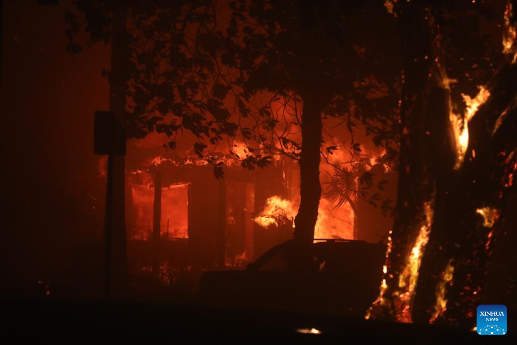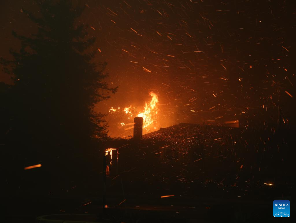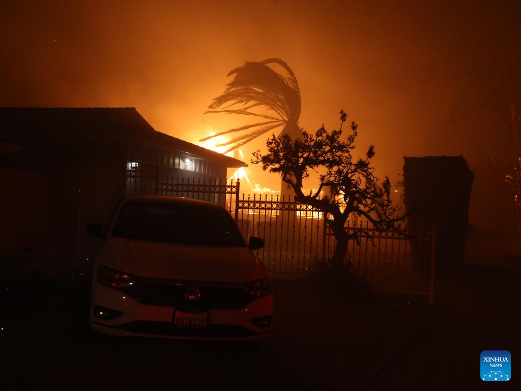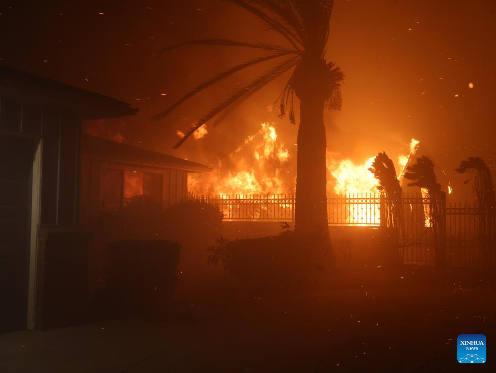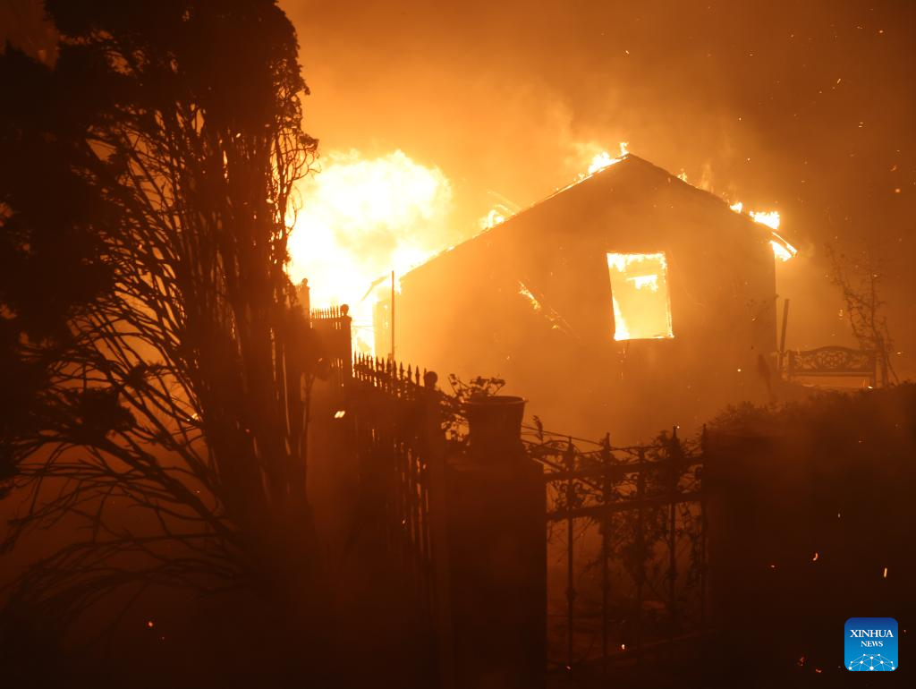 A house is engulfed by the flames on the site of the Palisades fire in Pacific Palisades, Los Angeles County, California, the United States, on Jan. 7, 2025. Three major wildfires raging across Los Angeles County, the most populous county of the United States, killed at least two people and forced tens of thousands of residents to be evacuated, the county's Fire Chief Anthony Marrone said Wednesday. The Palisades fire, a devastating wind-driven brush fire in Pacific Palisades started on Tuesday, spread to 5,000 acres (20.23 square kilometers) as of Wednesday with zero containment. (Photo by Qiu Chen/Xinhua)