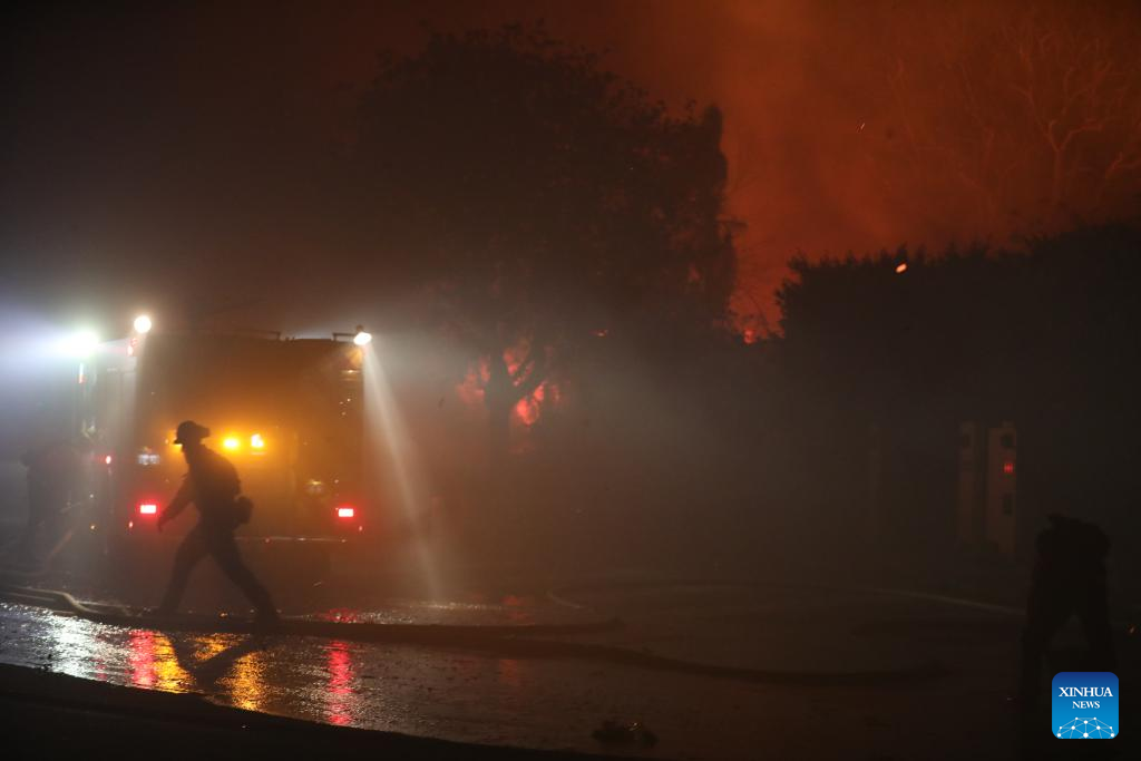 LOS ANGELES, Jan. 8 (Xinhua) -- Three major wildfires raging across Los Angeles County, the most populous county of the United States, killed at least two people and forced tens of thousands of residents to be evacuated, the county's Fire Chief Anthony Marrone said Wednesday.