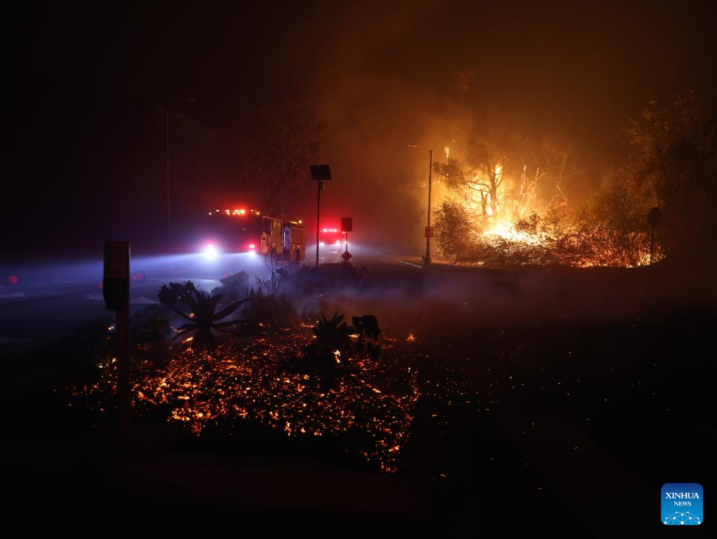 Fire trucks are seen on the site of the Palisades fire in Pacific Palisades, Los Angeles County, California, the United States, on Jan. 7, 2025. Three major wildfires raging across Los Angeles County, the most populous county of the United States, killed at least two people and forced tens of thousands of residents to be evacuated, the county's Fire Chief Anthony Marrone said Wednesday. The Palisades fire, a devastating wind-driven brush fire in Pacific Palisades started on Tuesday, spread to 5,000 acres (20.23 square kilometers) as of Wednesday with zero containment. (Photo by Qiu Chen/Xinhua)