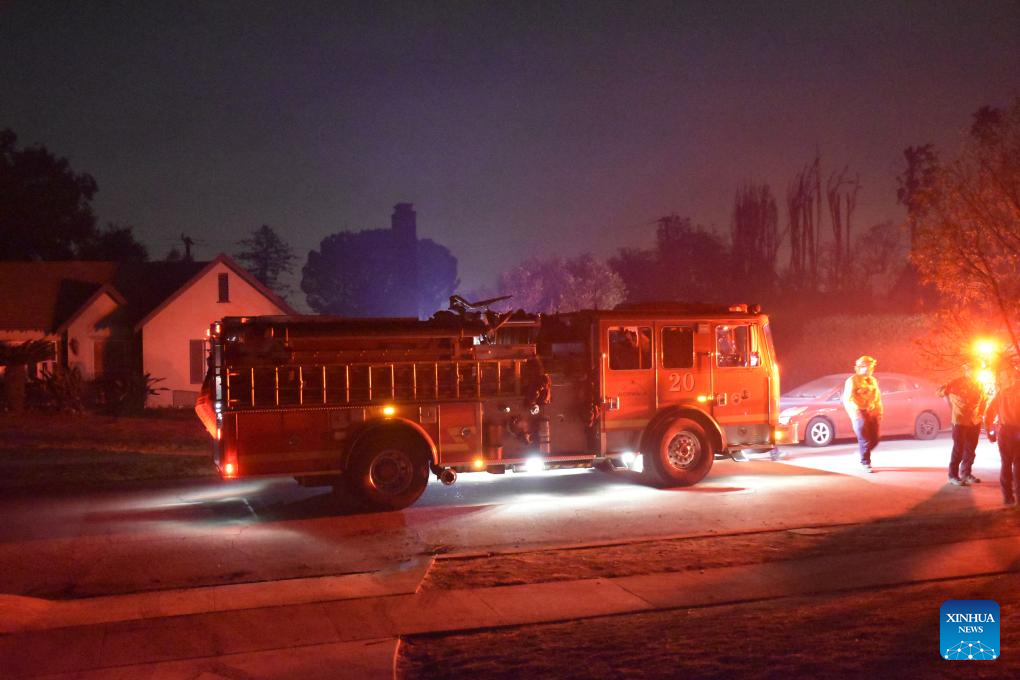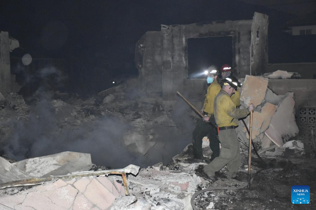 Firefighters work in Altadena, Los Angeles County, California, the United States, on Jan. 9, 2025. At least 10 people are known to have died in the wildfires raging around Los Angeles, the county's medical examiner department said on Thursday. (Photo by Gao Chuling/Xinhua)