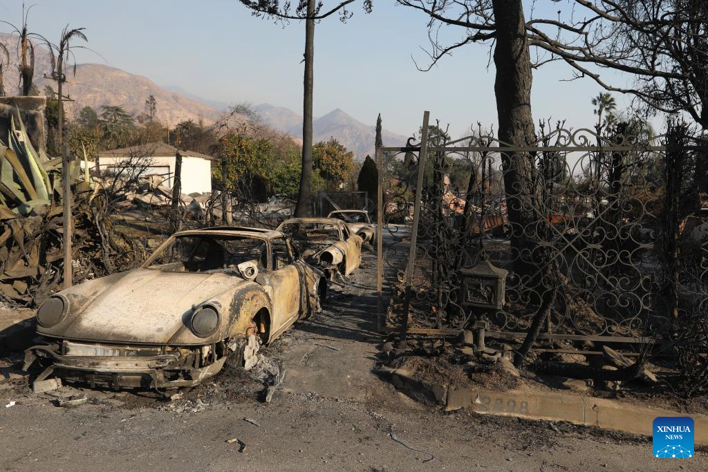 Cars destroyed by the blaze are seen in Altadena, Los Angeles County, California, the United States, on Jan. 10, 2025. Devastating wildfires continue to rage across different parts of Los Angeles County on Friday, leading to widespread disruptions, including school closures and the cancellation of entertainment, sports, and community events.