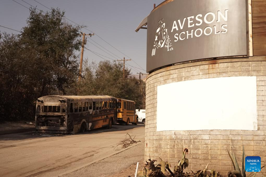 A school bus destroyed by the blaze is seen in Altadena, Los Angeles County, California, the United States, on Jan. 10, 2025. Devastating wildfires continue to rage across different parts of Los Angeles County on Friday, leading to widespread disruptions, including school closures and the cancellation of entertainment, sports, and community events.