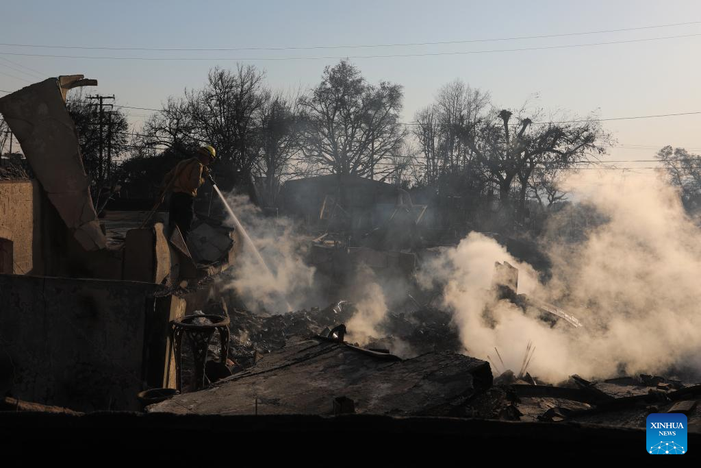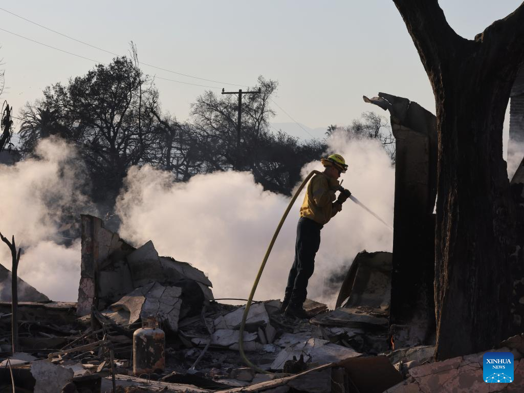 A firefighter works in the wildfire-ravaged area of Altadena, Los Angeles County, California, the United States, on Jan. 10, 2025. Devastating wildfires continue to rage across different parts of Los Angeles County on Friday, leading to widespread disruptions, including school closures and the cancellation of entertainment, sports, and community events.