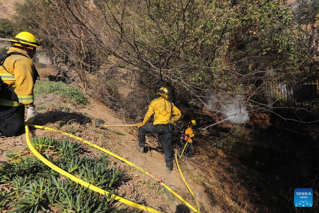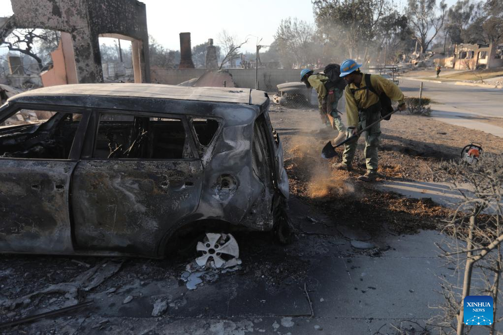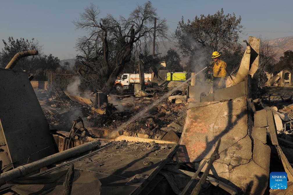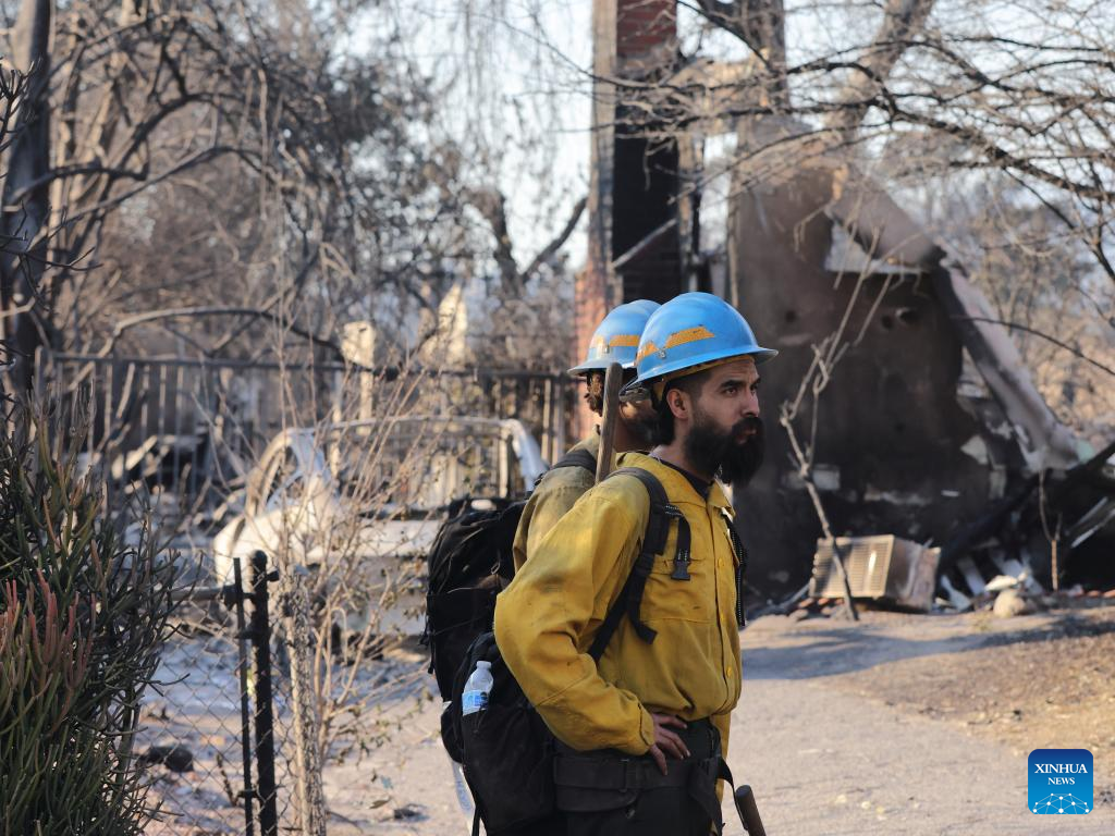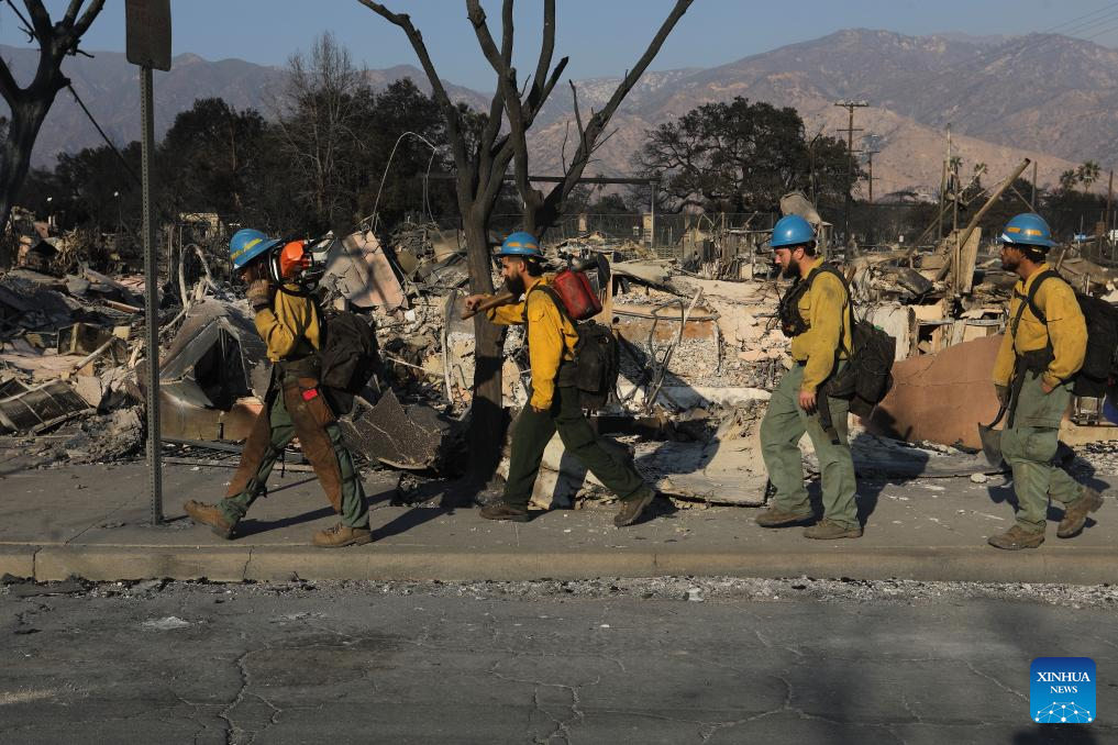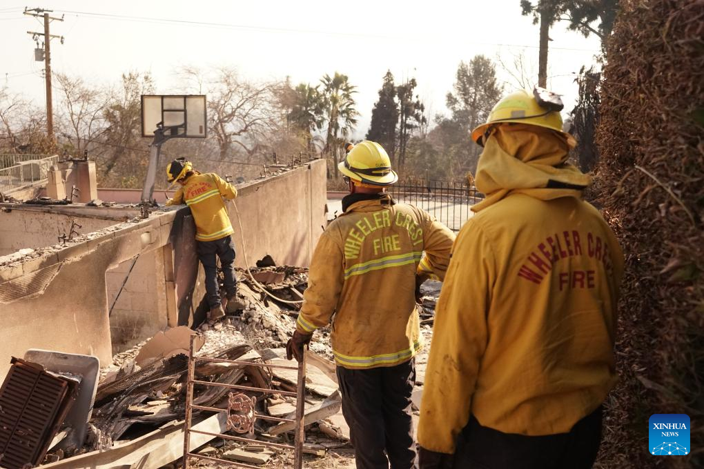 Firefighters work in the wildfire-ravaged area of Altadena, Los Angeles County, California, the United States, on Jan. 10, 2025. Devastating wildfires continue to rage across different parts of Los Angeles County on Friday, leading to widespread disruptions, including school closures and the cancellation of entertainment, sports, and community events.