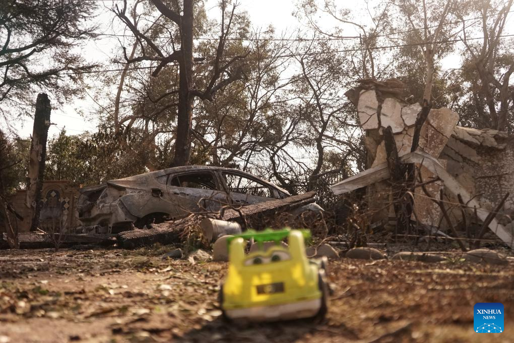 A car destroyed by the blaze is seen in Altadena, Los Angeles County, California, the United States, on Jan. 10, 2025. Devastating wildfires continue to rage across different parts of Los Angeles County on Friday, leading to widespread disruptions, including school closures and the cancellation of entertainment, sports, and community events.