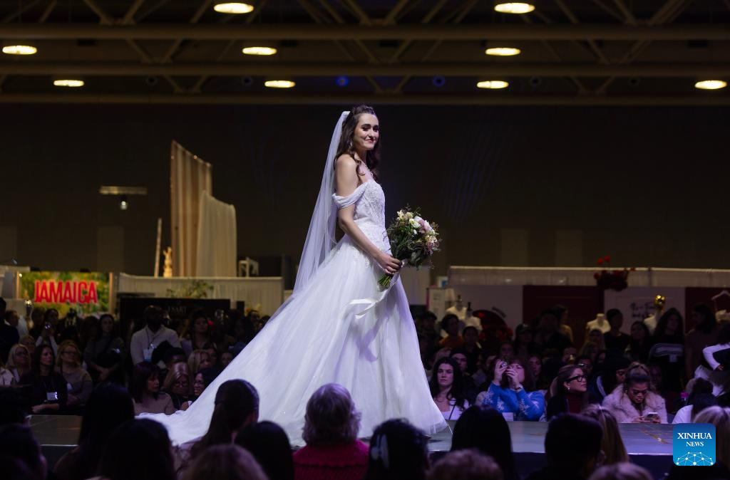 A model presents a wedding dress during the 2025 Canada's Bridal Show in Toronto, Canada, on Jan. 11, 2025. Showcasing the latest trends in bridal fashion, this annual event lasts from Jan. 10 to 12. (Photo by Zou Zheng/Xinhua)