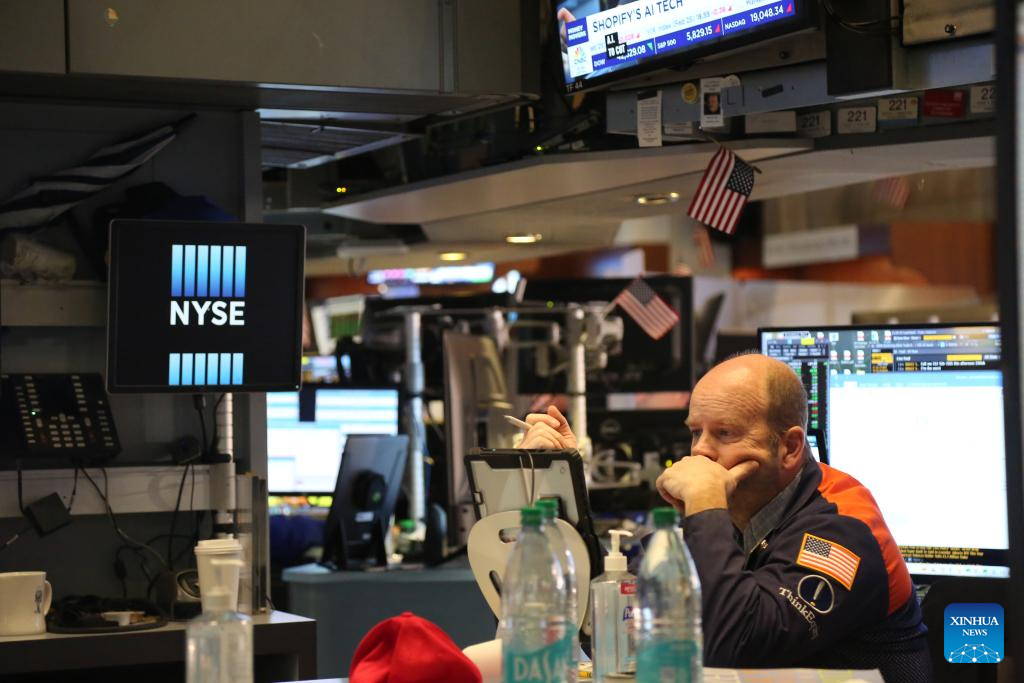 A trader works on the floor of New York Stock Exchange in New York, the United States, on Jan. 14, 2025. U.S. stocks ended mixed on Tuesday. The Dow Jones Industrial Average rose 221.16 points, or 0.52 percent, to 42,518.28. The S&P 500 added 6.69 points, or 0.11 percent, to 5,842.91. The Nasdaq Composite Index shed 43.71 points, or 0.23 percent, to 19,044.39. (Xinhua/Liu Yanan)