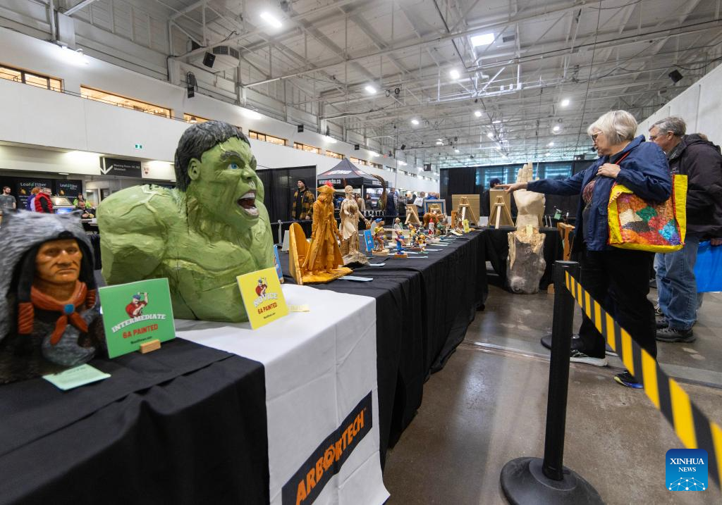 A woman looks at woodcarvings during the 2025 Toronto Woodworking Show in Mississauga, the Greater Toronto Area, Canada, on Jan. 17, 2025. With top exhibitors, hands-on demonstrations, educational seminars, unique products and more, the annual event is held here from Friday to Sunday. (Photo by Zou Zheng/Xinhua)