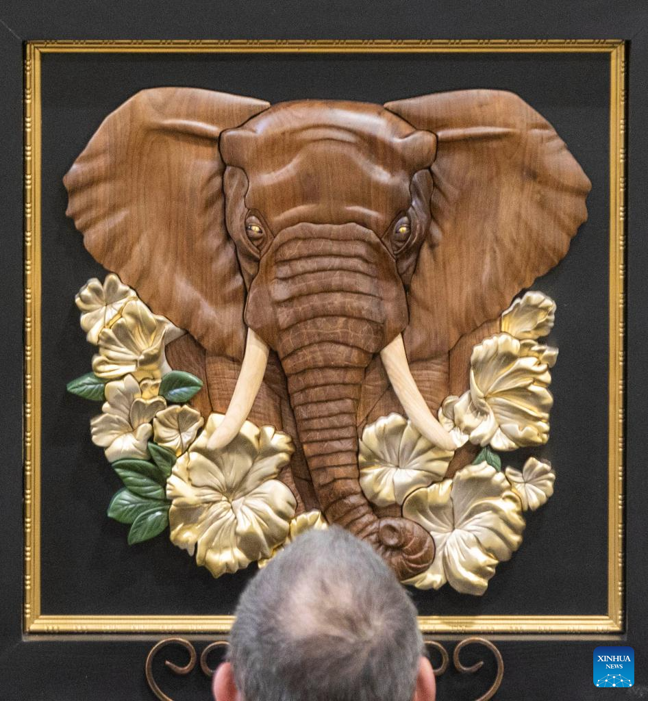 A man looks at a woodcarving during the 2025 Toronto Woodworking Show in Mississauga, the Greater Toronto Area, Canada, on Jan. 17, 2025. With top exhibitors, hands-on demonstrations, educational seminars, unique products and more, the annual event is held here from Friday to Sunday. (Photo by Zou Zheng/Xinhua)