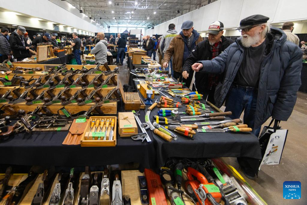 People look at wood carving tools during the 2025 Toronto Woodworking Show in Mississauga, the Greater Toronto Area, Canada, on Jan. 17, 2025. With top exhibitors, hands-on demonstrations, educational seminars, unique products and more, the annual event is held here from Friday to Sunday. (Photo by Zou Zheng/Xinhua)
