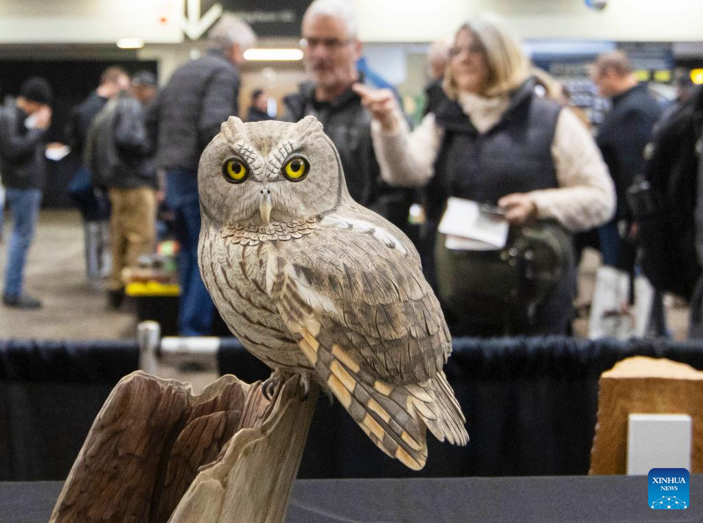 A carved wooden owl is seen during the 2025 Toronto Woodworking Show in Mississauga, the Greater Toronto Area, Canada, on Jan. 17, 2025. With top exhibitors, hands-on demonstrations, educational seminars, unique products and more, the annual event is held here from Friday to Sunday. (Photo by Zou Zheng/Xinhua)