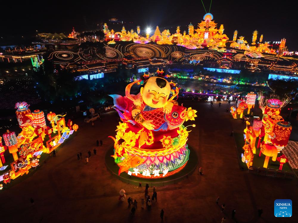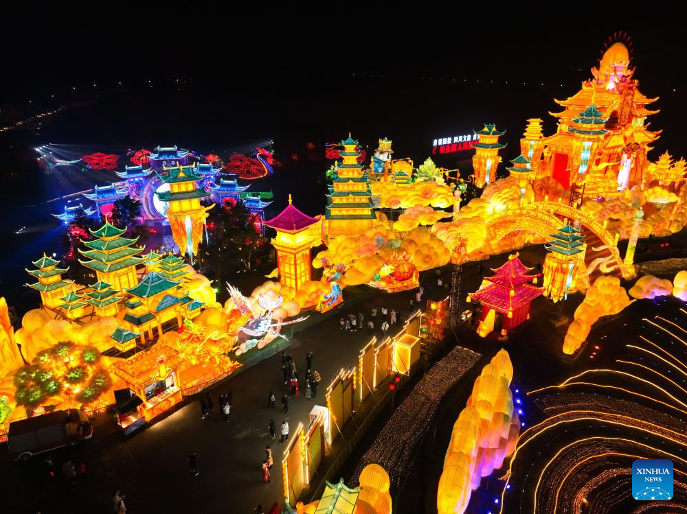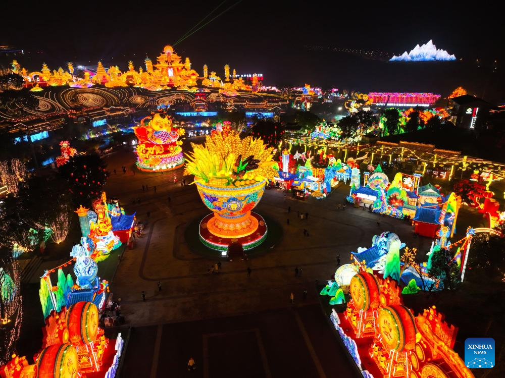 An aerial drone photo shows a view of the 31st Zigong International Dinosaur Lantern Show in Zigong, southwest China's Sichuan Province, Jan. 17, 2025. The 31st Zigong International Dinosaur Lantern Show kicked off here on Friday. This year's lantern show features 12 groups of super-large light sets, seven groups of large light sets and more than 200 groups of small and medium-sized light sets. The scale of the lantern displays has set a new record in the history of the Zigong International Dinosaur Lantern Show. (Xinhua/Wang Xi)