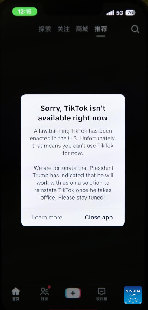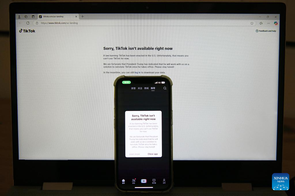 This photo taken in Arlington, the United States on Jan. 19, 2025 shows screens of a mobile phone and a laptop displaying the message "Sorry, TikTok isn't available right now." The popular video-sharing app TikTok went dark late Saturday in the United States. TikTok users in the country were greeted with a message that read: "Sorry, TikTok isn't available right now." "A law banning TikTok has been enacted in the U.S. Unfortunately, that means you can't use TikTok for now," read the message, adding that: "We are fortunate that President Trump has indicated that he will work with us on a solution to reinstate TikTok once he takes office. Please stay tuned!" U.S. President-elect Donald Trump said earlier on Saturday that he will "most likely" give TikTok a 90-day extension on Inauguration Day, which is Monday. (Xinhua/Li Rui)