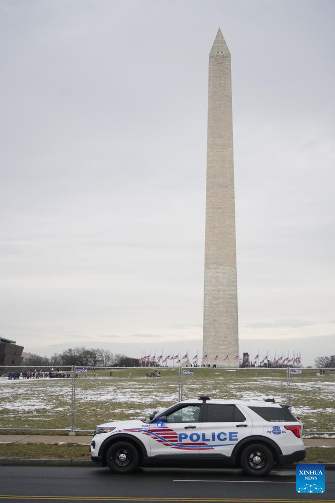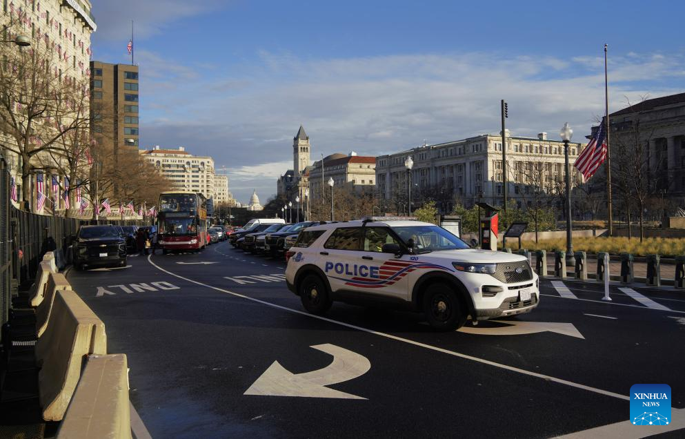 A police vehicle patrols on the street in Washington, D.C., the United States, Jan. 18, 2025. President-elect Donald Trump announced on social media that his inauguration is expected to be moved indoors Monday due to freezing weather projected in Washington, D.C. (Xinhua/Wu Xiaoling)