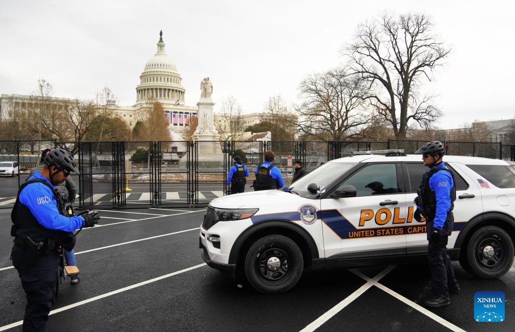 Police officers are pictured outside the U.S. Capitol building in Washington, D.C., the United States, Jan. 18, 2025. President-elect Donald Trump announced on social media that his inauguration is expected to be moved indoors Monday due to freezing weather projected in Washington, D.C. (Xinhua/Wu Xiaoling)