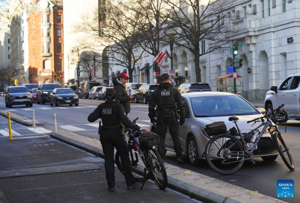Police officers inspect a vehicle near the White House in Washington, D.C., the United States, Jan. 18, 2025. President-elect Donald Trump announced on social media that his inauguration is expected to be moved indoors Monday due to freezing weather projected in Washington, D.C. (Xinhua/Wu Xiaoling)