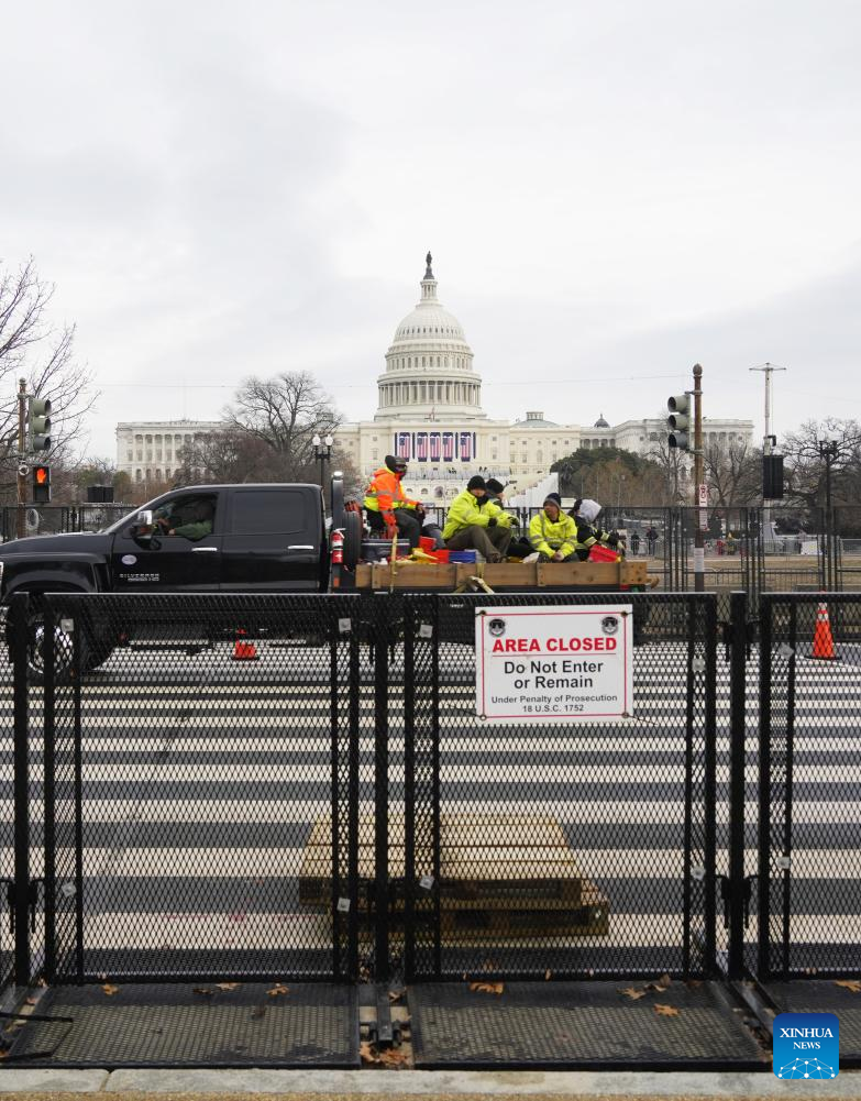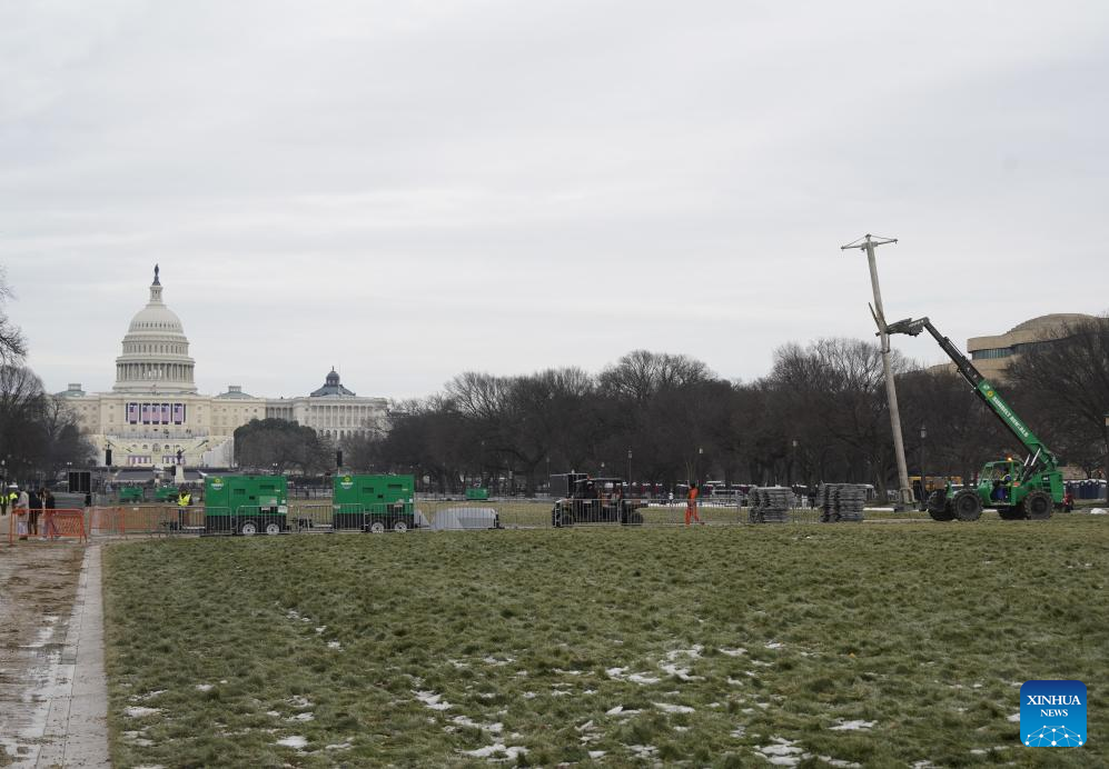 Staff members dismantle facilities for viewing the inauguration ceremony of President-elect Donald Trump outside the U.S. Capitol building in Washington, D.C., the United States, Jan. 18, 2025. President-elect Donald Trump announced on social media on Friday that his inauguration is expected to be moved indoors Monday due to freezing weather projected in Washington, D.C.
