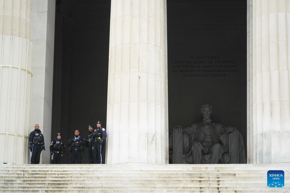 Police officers stand guard at the Lincoln Memorial in Washington, D.C., the United States, Jan. 18, 2025. President-elect Donald Trump announced on social media that his inauguration is expected to be moved indoors Monday due to freezing weather projected in Washington, D.C. (Xinhua/Wu Xiaoling)