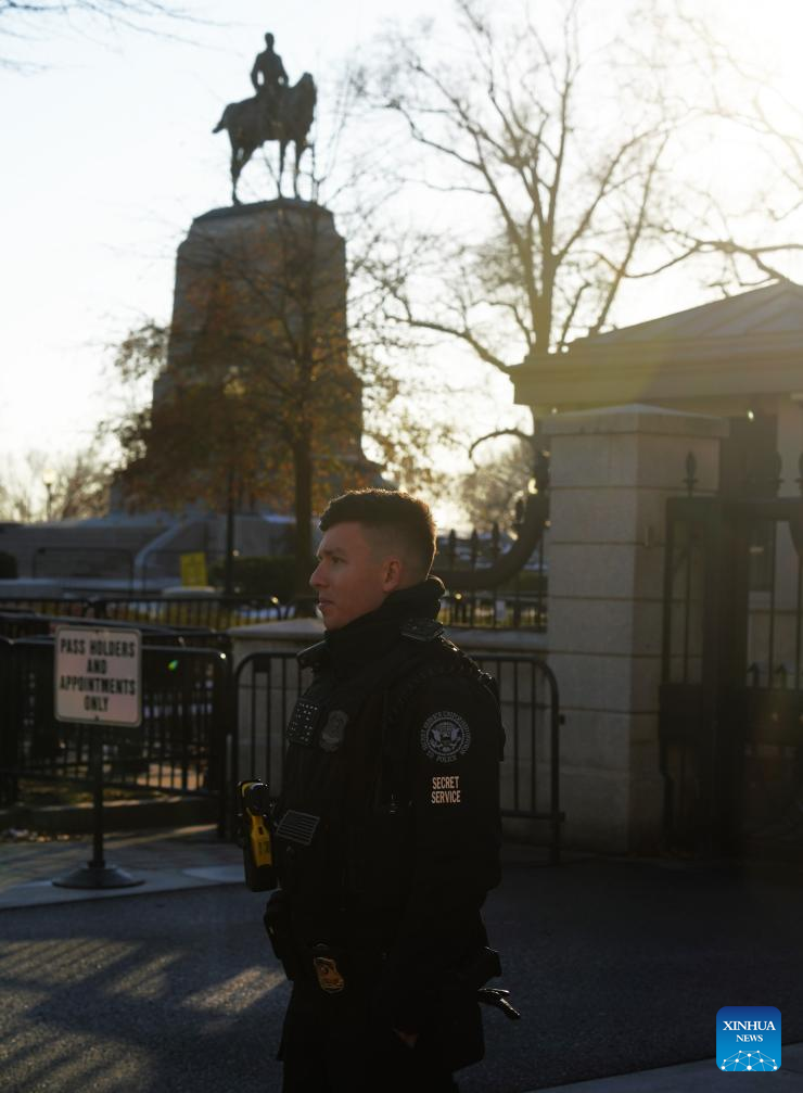 A police officer stands guard near the White House in Washington, D.C., the United States, Jan. 18, 2025. President-elect Donald Trump announced on social media that his inauguration is expected to be moved indoors Monday due to freezing weather projected in Washington, D.C. (Xinhua/Wu Xiaoling)