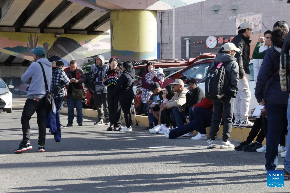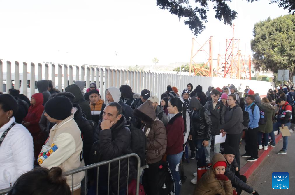 Migrants line up at the Chaparral checkpoint in Tijuana, Mexico, Jan. 20, 2025. Minutes after President Donald Trump took office on Monday, the U.S. Customs and Border Protection (CBP) announced it has canceled all scheduled appointments for immigration and border processing. The CBP announced on social media that it would shut down the CBP One mobile app that allowed migrants to submit information and book appointments at eight U.S.-Mexico border ports after 11:00 p.m. Central Standard Time. (Photo by Joebeth Terriquez/Xinhua)