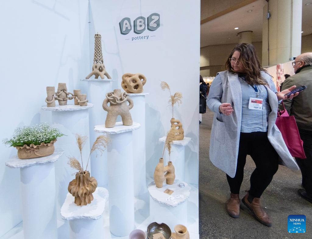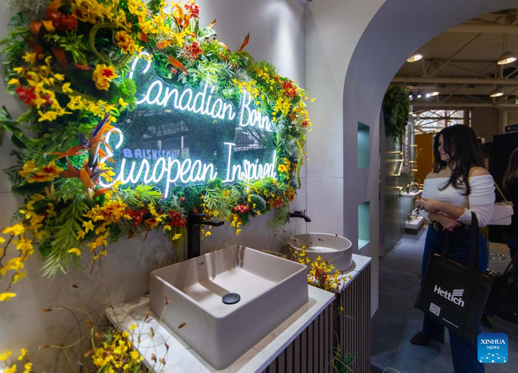 A woman looks at a design work during the 2025 Interior Design Show in Toronto, Canada, on Jan. 23, 2025. This annual event kicked off here on Thursday and will last until Jan. 26. (Photo by Zou Zheng/Xinhua)