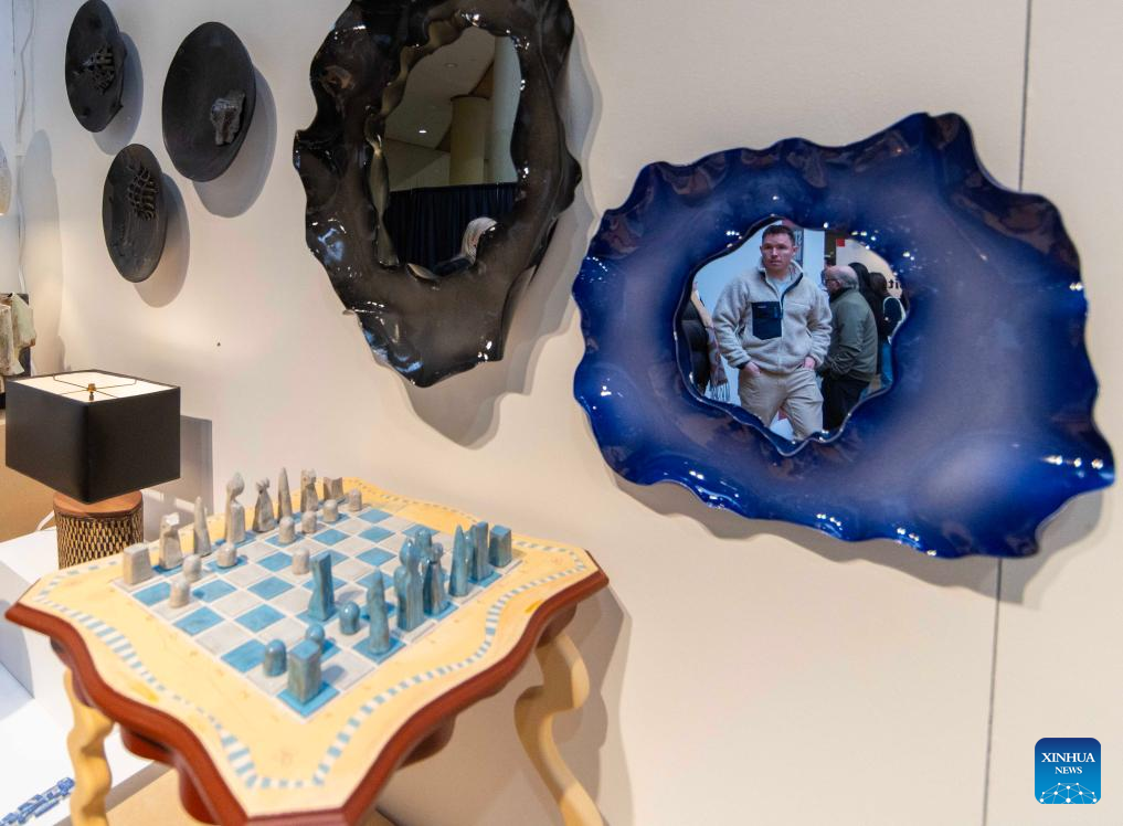 A man is reflected in a mirror as he looks at design works during the 2025 Interior Design Show in Toronto, Canada, on Jan. 23, 2025. This annual event kicked off here on Thursday and will last until Jan. 26. (Photo by Zou Zheng/Xinhua)
