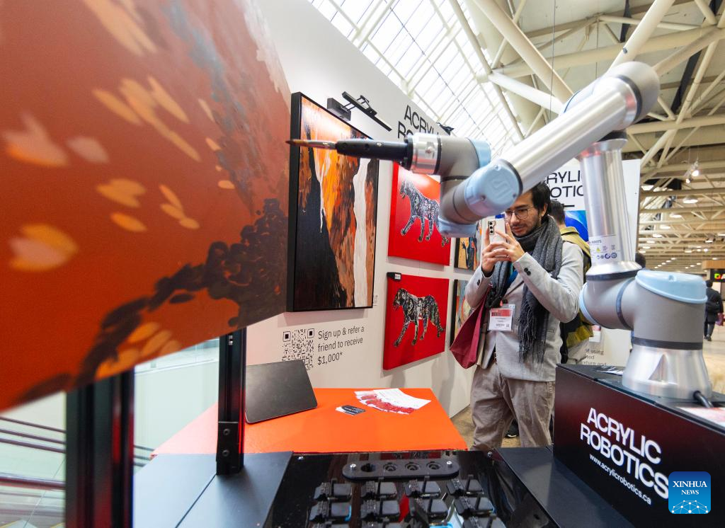 A man films a robot drawing a picture during the 2025 Interior Design Show in Toronto, Canada, on Jan. 23, 2025. This annual event kicked off here on Thursday and will last until Jan. 26. (Photo by Zou Zheng/Xinhua)